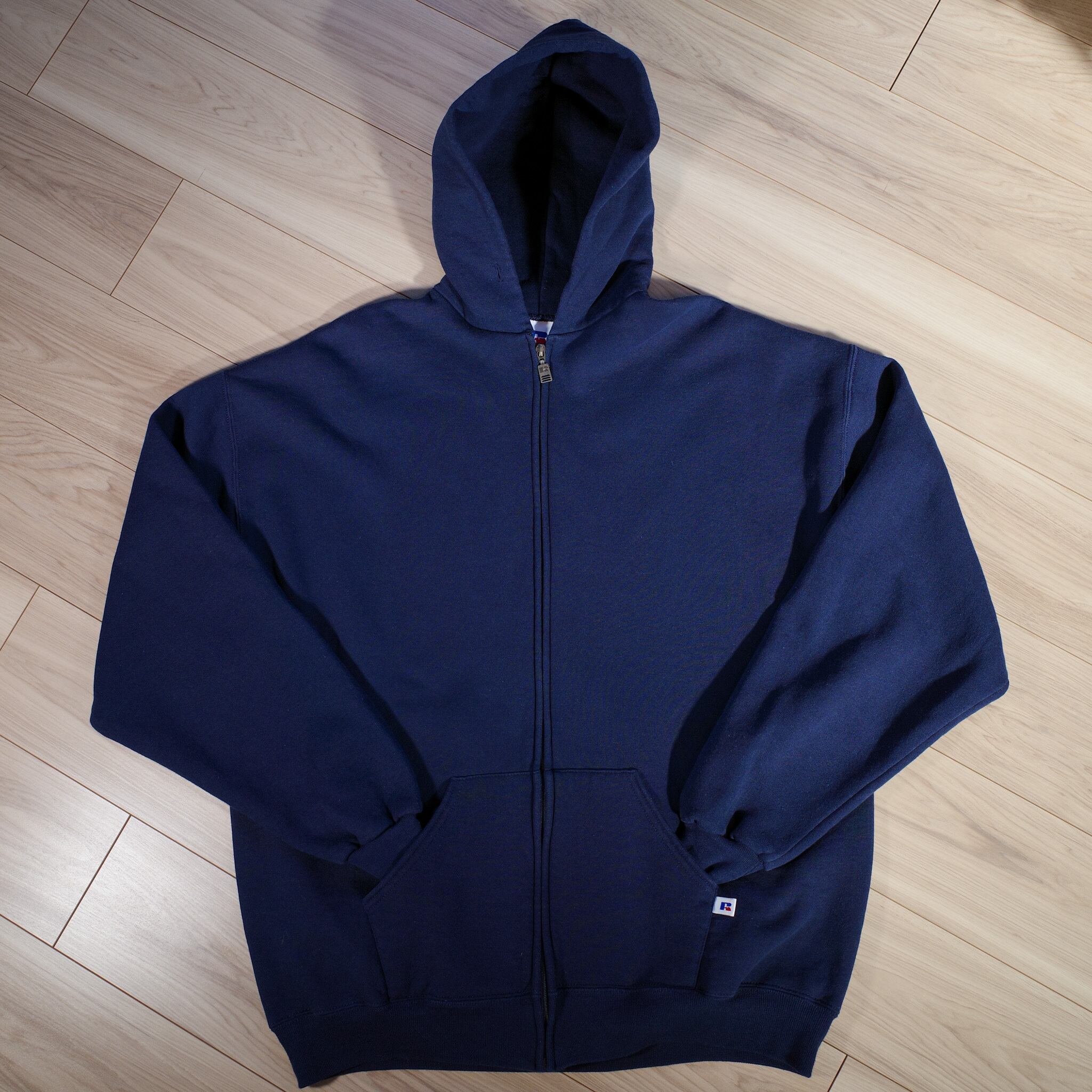 ネイビーのラッセルジップアップフーディー。縮みなしのXLサイズ。身幅やアームが広めのシルエットがいいし、リブの締めつけはしっかりしているし、フードも大きめで立体感があるし、ラッセル特有のもちもちした生地感も可愛いし。パッと見ふつーなんだけど、細かいひとつひとつのクオリティが高くて最高だと思います。着心地も抜群です。個人的に無地フーディーの頂点。おすすめです。